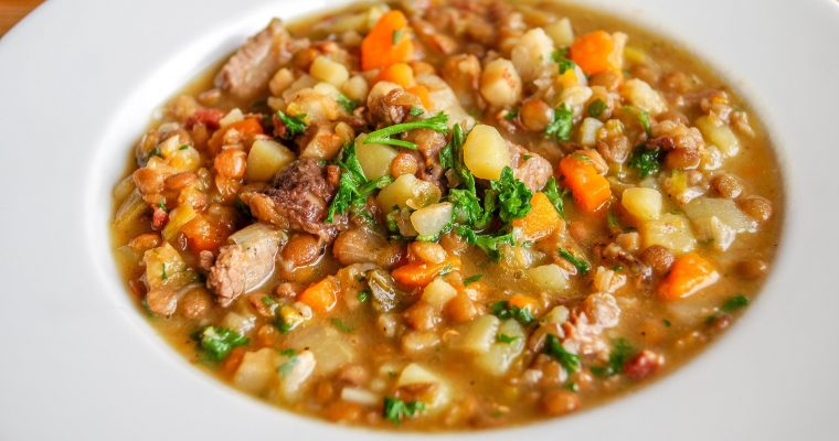 Zutaten 8 Scheiben geräucherter, durchwachsener Speck 1 Stange Porree (Lauch; ca. 300 g) 1 Stange Staudensellerie 600 g Kartoffeln (mehlig kochend) 1 1/4 l Hühnerbrühe Salz frisch geriebene Muskatnuss 600 g Wirsingkohl Pfeffer Zubereitung Speck in einem Topf unter Wenden knusprig braten. Porree putzen, waschen, […]